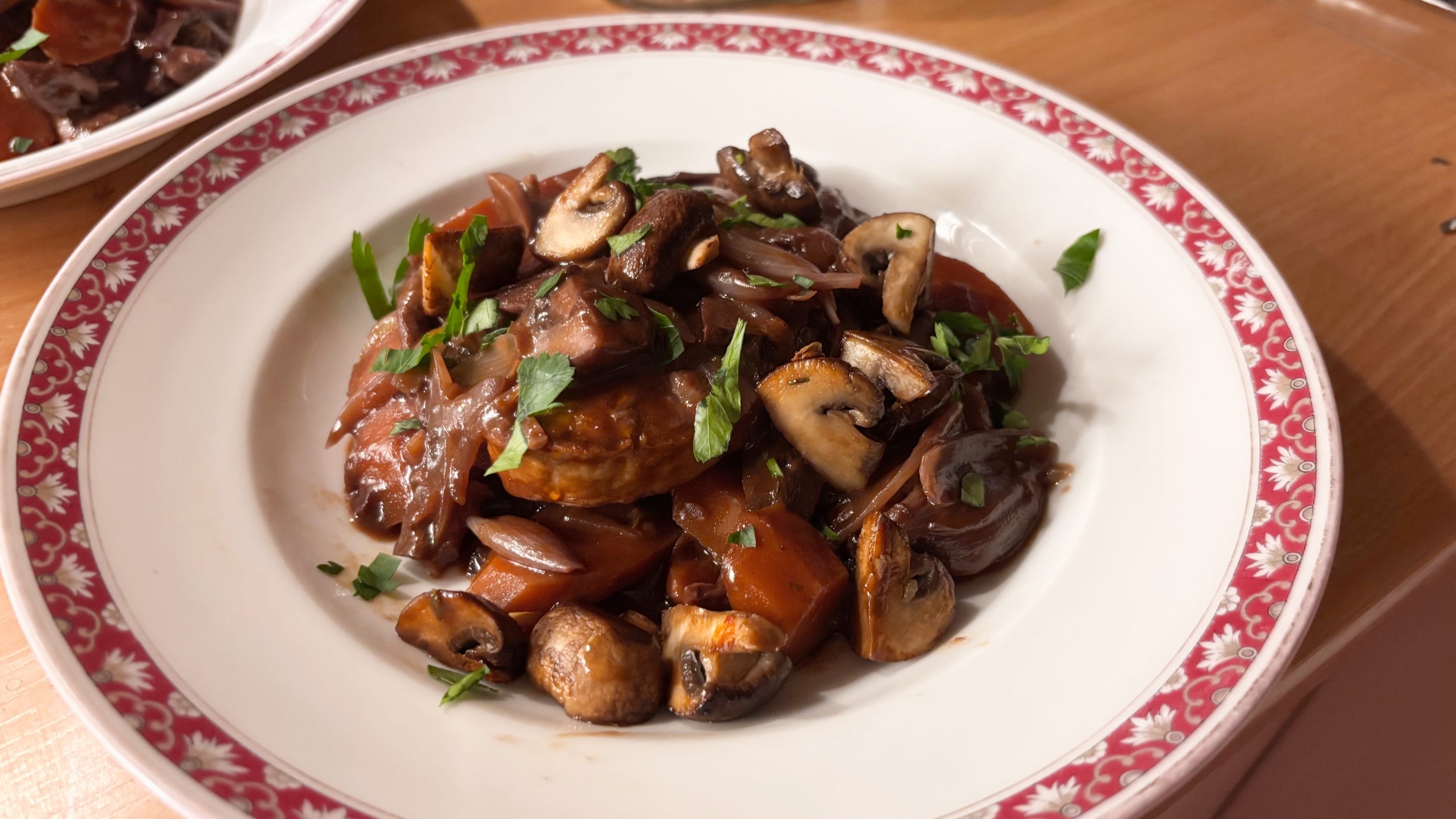 Soak porcini for 15 minutes in hot water. Heat a knob of butter in a frying pan and sauté half of the mushrooms for 5 minutes until browned. Transfer to a plate, heat another knob of butter, and fry the rest of the mushrooms. Place them on the plate as well. Heat a knob of butter in a Dutch oven and sauté the shallots, garlic, carrots, and bouquet garni for 5 minutes. Stir in the tomato paste. Stir in flour very well, then add hot stock while stirring. The sauce will thicken. Add the wine, porcini, half of the cooked mushrooms, Worcestershire sauce, and pepper. Reduce the heat, cover, and gently cook for 30 minutes, stirring occasionally. Brown the plant-based “chicken” in a knob of butter; 2 minutes per side. Add the rest of the mushroom and the chicken to the sauce, cover, and cook for a final 5 minutes. Serve with boiled or mashed potatoes.